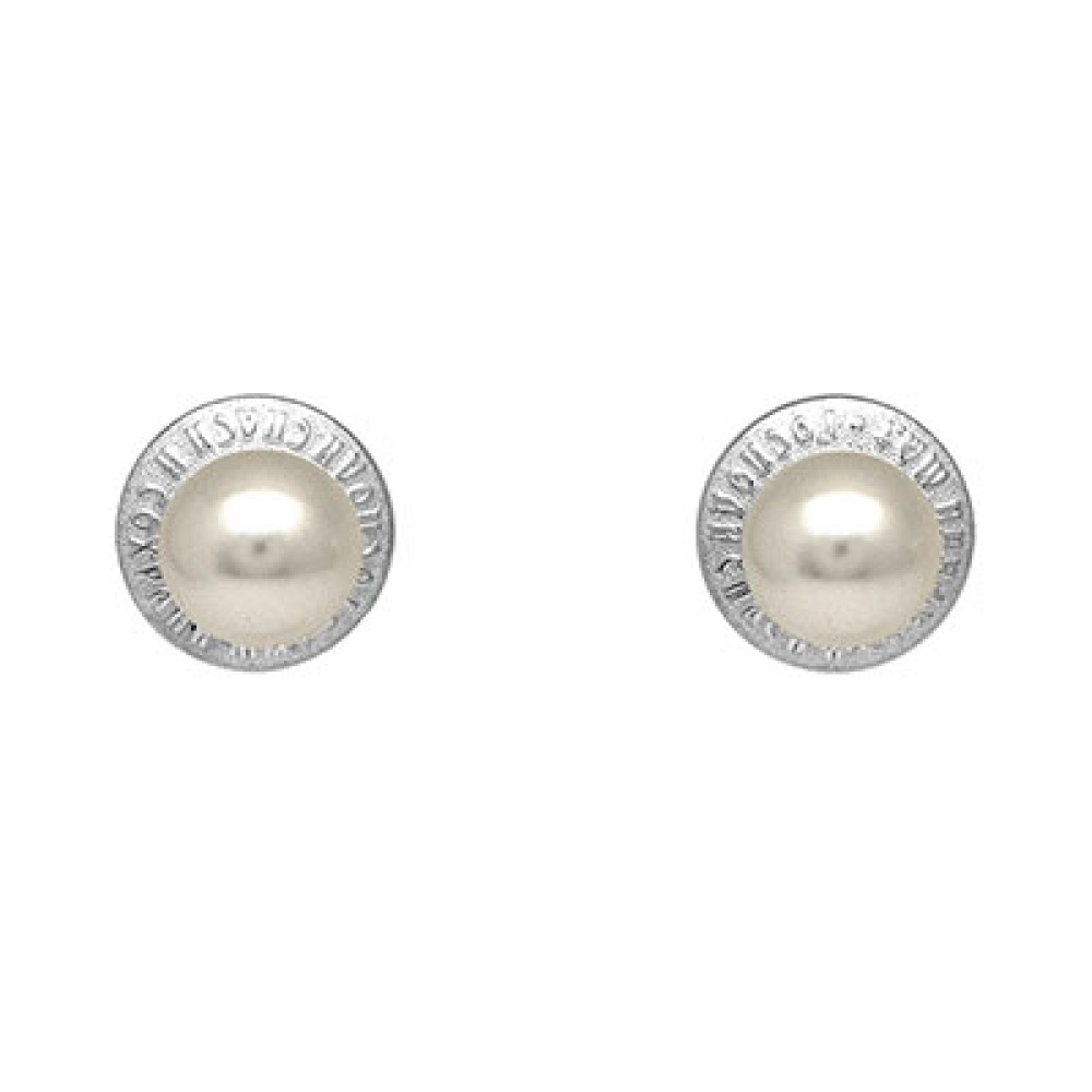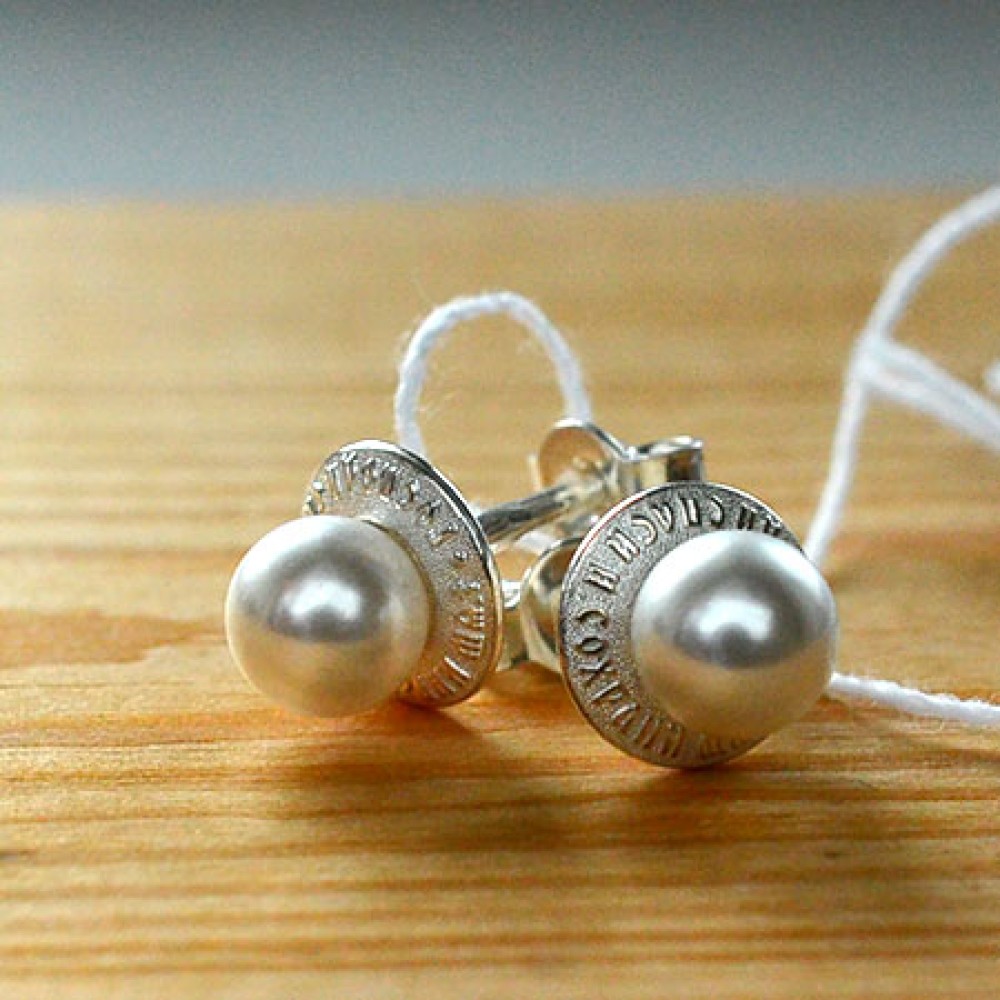 Милые серьги пусеты из серебра, жемчуг, молитва Спаси и сохрани по краю ободка, артикул 50718